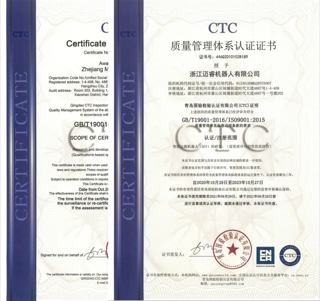迈睿机器人坚持以“匠心精神”打磨中国制造,依托强大的研发能力和健全的供应链管理体系,为高可靠性、高品质产品的生产提供有力支撑。针对供应链管理体系,通过SCOR模型实践,进行业务全流程整合提升。同时针对产品进行整个生命周期的全方位测试,包括7×24小时长周期稳定性运行测试、35万次基于1吨的高负载举升结构顶升测试、复杂环境测试等等,以提升产品可靠性。公司产品研发及生产均满足国家质量管理体系标准要求,通过了国家ISO9001认证。