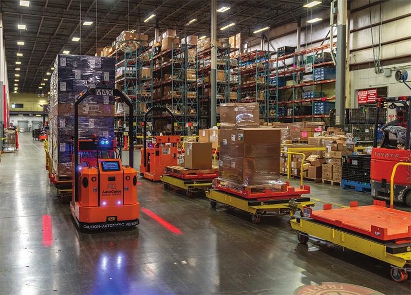 自主解决方案使公司的运营效率大大提高。对于每一次运输,AMR车队控制软件都能识别出通往仓库货架的最有效路线。每台AMR牵引车单次最多可以运输8个托盘和10,000磅的成品。每天行驶的总里程数为30-40英里,而人工叉车每次运输同样的有效载荷1,000磅需要200多英里。
