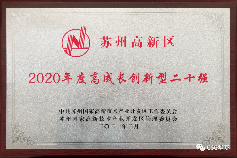 会议对高新区内多家优秀企业和先进工作者进行了颁奖表彰,华晓精密苏州工业有限公司(以下简称CSG华晓)获“苏州高新区2020年度高成长创新型二十强”称号。