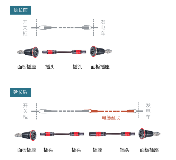 由于电缆连接装置的连接方式是插拔式,因此电缆的长度可轻松调节。当发电车无法靠近电源柜时,电缆长度可通过如下方式延长,安全且快捷。