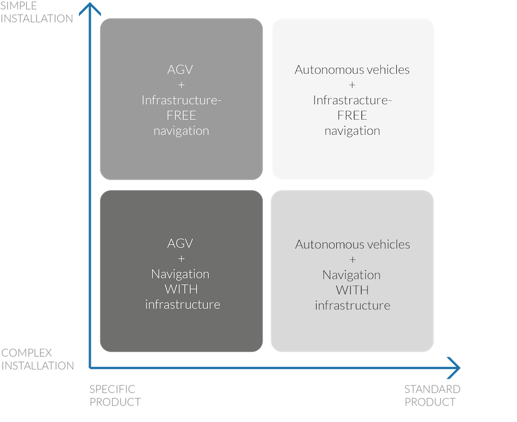 AGV是专为客户应用而设计的。它们是小批量生产的,其导航系统是基于附加的基础设施(地面、墙壁、机架、机器等)来允许机器移动并知道其在空间中的位置。AGV制造商的产品供应是由项目/客户组织的。