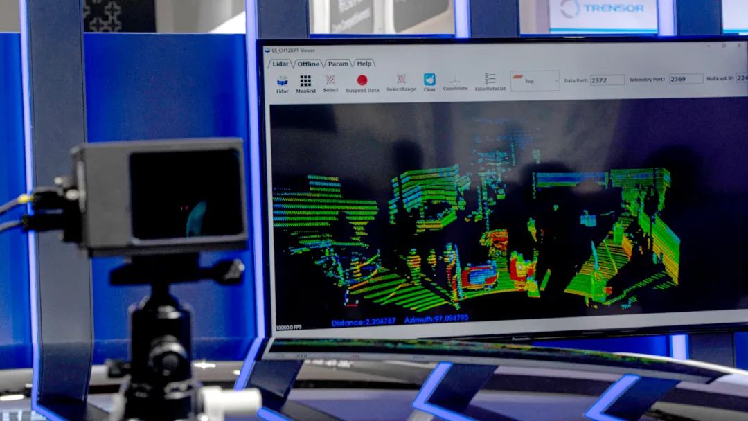 观众从现场可以直观看到CH128X1实时演示的点云效果。那么,我们怎么判断雷达的点云成像质量好与否呢?其实,激光雷达发射激光出去后,接收回来的每一个点会向系统输出一个x,y,z值,这些点会根据x,y,z值还原到坐标系下,精度越高准确度越高,所形成的点云排布越整齐,成像越清晰。CH128X1对展位环境的三维成像边缘清晰、干净整洁没有噪点,由此可见,其所宣称的±3cm精度做的一致性是比较高的。从整体上看,CH128X1的点云几乎没有什么明显跳动,可见其稳定性也较高。