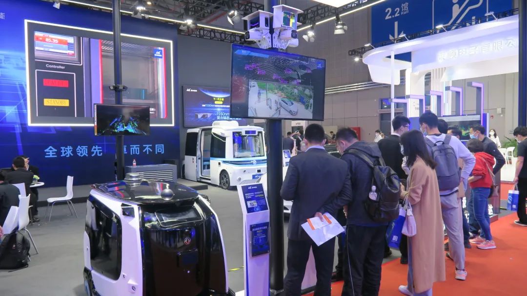 此外,雷达对低反目标的探测性能也很重要,特别是当遇到黑色的吸光物体,激光雷达的探测性能往往会大大减弱。而这方面,CH128X1似乎表现得丝毫没有忌讳。目之所及,镭神智能的展位全铺了深灰色的地毯(反射率恰好大约为10%),而CH128X1对地面的探测成像依然非常的整齐划一,包括展位里摆放的东风sharing-smart无人扫地车的黑色车体,其也是有清晰的成像可呈现出来,可见其对低反吸光的物体也依然拥有非常好的探测性能。