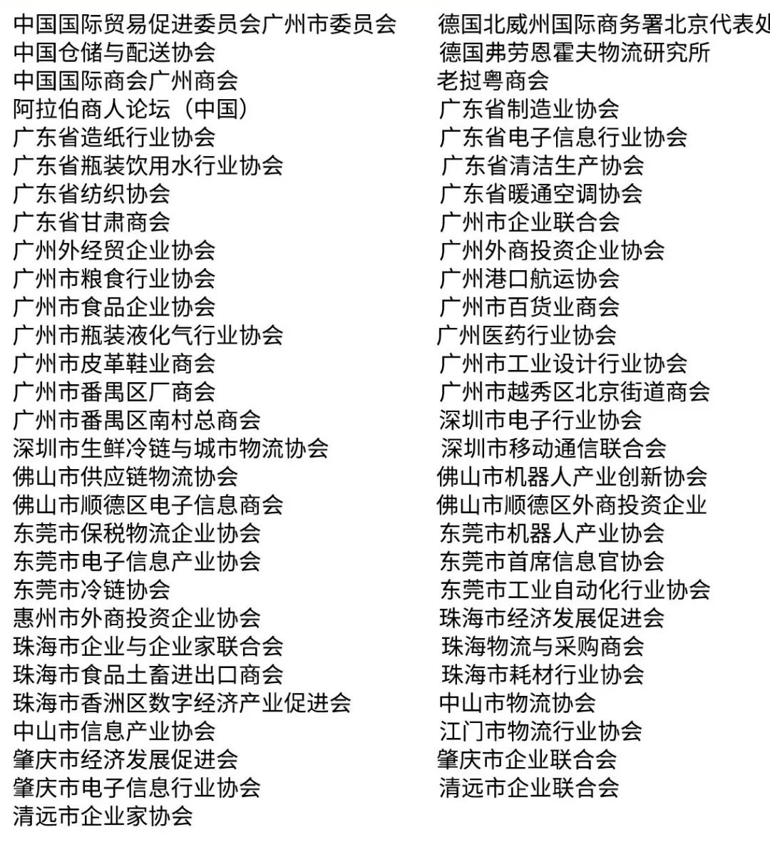 立足广州,辐射大湾区,打通一带一路。作为华南物流技术的风向标的专业类展会,LET 2021非常荣幸地得到了来自国内外各地区各商协会的支持,包括中国国际贸易促进委员会广州市委员会、中国国际商会广州商会、德国北威州国际商务署、西班牙驻华大使馆广州经济商务处、巴基斯坦驻广州总领事馆商务处、阿拉伯商人论坛(中国)、老挝粤商会、非洲广东总商会、中国仓储与配送协会、广东省制造业协会、广东省电子信息行业协会、广州市粮食行业协会、广州市食品企业协会、广州医药行业协会、深圳市电子行业协会、东莞市电子信息产业协会、珠海市企业与企业家联合会等近百家商协会,均对展会的顺利召开表达了支持与期待。汉诺威LET中国广州物流展支持单位