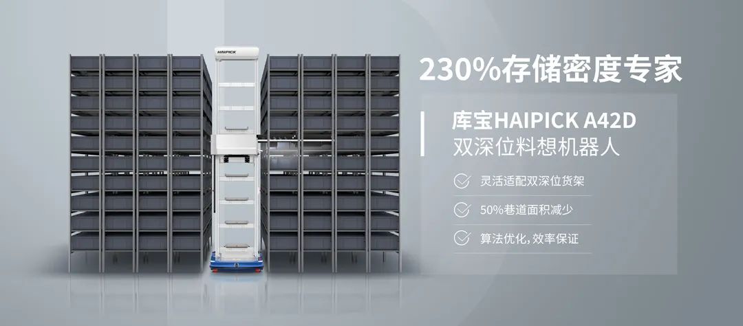 双深位料箱机器人HAIPICK A42D采用可定制化伸缩货叉,配置4.5米双深位货架,减少至多50%巷道面积,较传统人工仓,可提升130%存储密度;同时配置全新的取货方式及库位策略,满足多种业务场景需求,降低仓租成本,提升仓储柔性及效率。