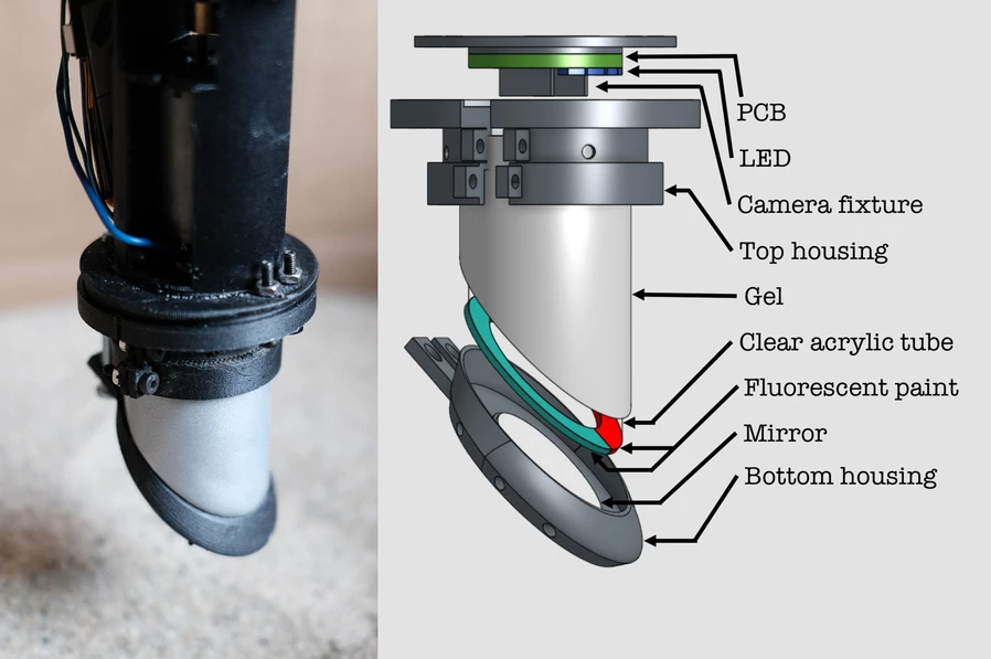 为了构建一个可以检测到淹没在沙子或砾石等颗粒状物质之下的物体的机器人系统,科学家们采用了之前研究出的GelSight技术并对Digger Finger机器人的设计进行了一些调整。这其中就包括了更改机器人的形状,使其变成带有斜角尖端的薄圆柱体,然后添加一些彩色荧光漆以节省空间。