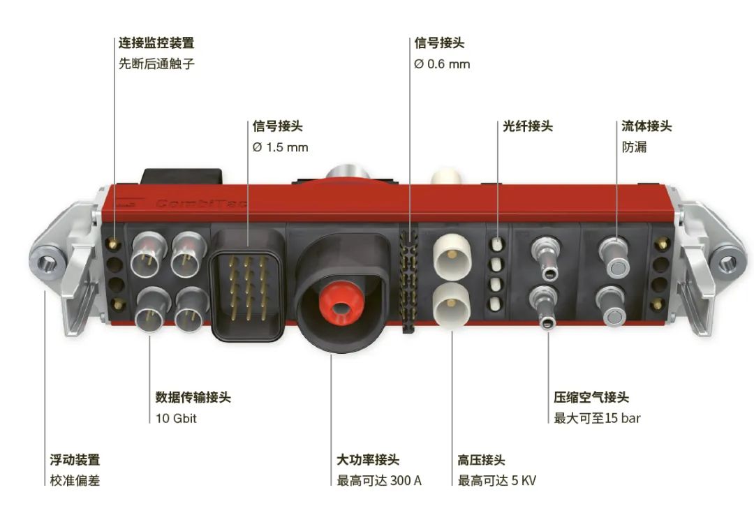 CombiTac模块化连接器采用独有的MULTILAM技术,可实现高达100,000次插拔寿命,额定电流可达300A,高压可达5KV,模块化设计可同时集成多种连接类型,如电流、信号、高压、数据、同轴、热电偶、光纤、气体和液体等,具有高抗冲击性和抗振性,其100%定制化,满足精确尺寸要求。通过在测试工装上使用CombiTac进行转接测试,电驱动测试环节实现自动对插,从而提高测试效率,降低安全风险,节省人工成本。同时连接器结构紧凑,减少了测试工位的设计空间,使测试线小型化。而其高插拔、高可靠性和低接触电阻优势确保测试持久稳定,降低产品维护成本。该方案具有较高的灵活性和通用性,适合多种类型的电驱动产品测试需求。