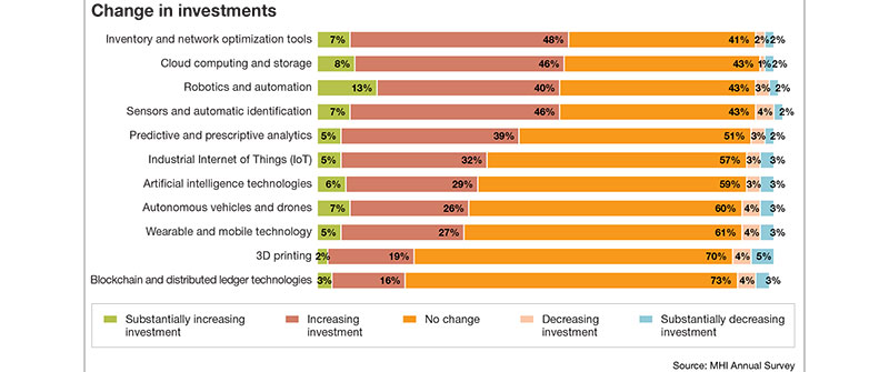 库存和网络优化工具、云计算和存储、机器人和自动化、传感器和自动识别名列榜首,超过50%的受访者表示他们已经或正在大幅增加在这些领域的投资。 据估计,30%到45%的受访者投资于这些领域,其中包括预测和说明性分析、工业物联网(IoT)、人工智能、自动驾驶汽车和无人机以及可穿戴移动技术。