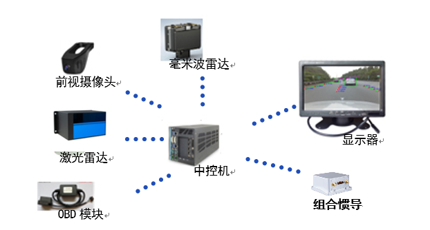 汽车车顶安装激光雷达一体化结构,其中固定有正前方安装CH128X1混合固态激光雷达,两侧和后方安装CH64W大视场补盲激光雷达,同时前方安装有短焦与长焦摄像头,两侧和后面安装广角摄像头,同时集成有GPS组合惯导,毫米波雷达安装在车辆正前方车牌附近,进行多传感器融合感知,对车辆周边360°范围内全范围检测,提高系统的稳定性及检测精度。