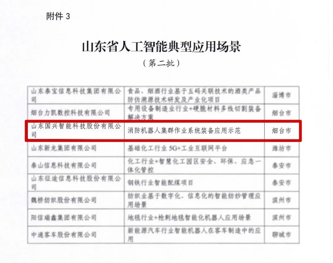 近日,山东省工业和信息化厅公布第二批山东省人工智能典型应用场景,山东国兴智能科技股份有限公司应用场景“消防机器人集群作业系统装备应用示范”榜上有名!