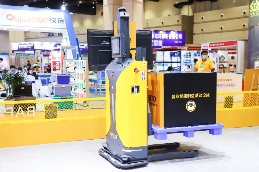 现场展示搭载了可实现车辆精准定位导航的BSLAM自主导航定位系统和支持车辆前进后退、原地旋转、弧线等多种运动方式和多种轮系的BANS单机控制系统(AGV/AMR控制器)的BITO地牛式叉车(BT-CPD10-D1),自主完成搬运任务。