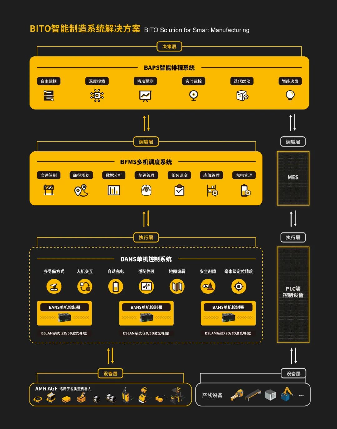 BITO致力于为客户提供从底层设备控制、中层调度规划再到上层分析决策的一体化完整智能制造解决方案,实现智能工厂的完整闭环。一体化完整智能制造解决方案包括:实时排产(BAPS智能排程系统),根据生产数据编排最优生产计划;多机调度(BFMS多机调度系统),接受上层指令进行移动机器人、叉车等的任务调度和路径规划;单机控制(BANS单机控制系统),让移动机器人具备自主行走、人机交互功能;以及自主导航定位(BSLAM系统),通过自然无反激光定位导航,实时动态建图和定位。