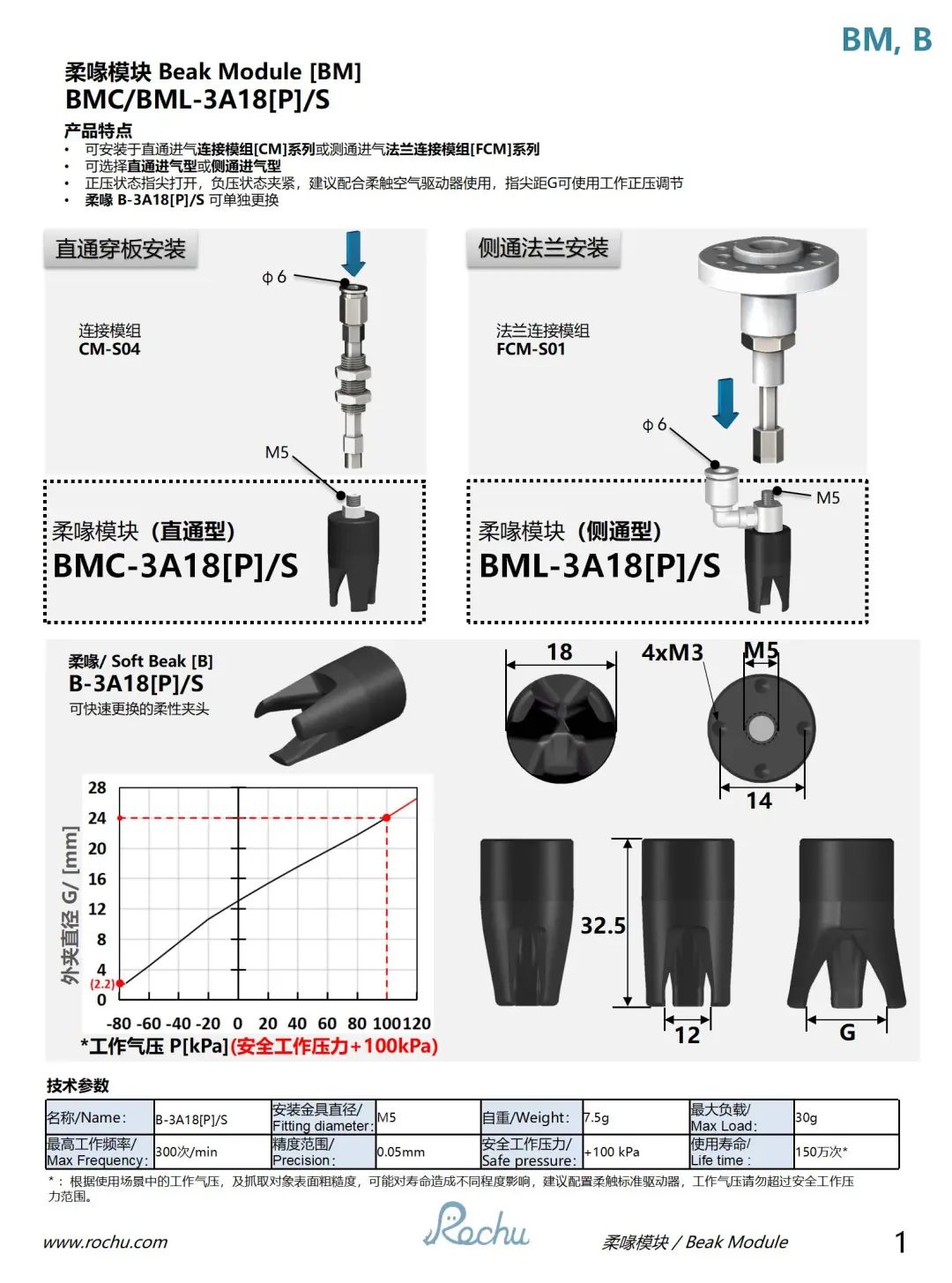 B-3A18[P]/S 型标准柔喙夹爪,能很好的用于嵌件的外抓以及内撑,可以在不更换夹爪的情况下抓取不同尺寸的薄壁类工件,圆柱类工件,抓取动作快速平稳,可应用于制造业、玻璃制品或者3C行业。