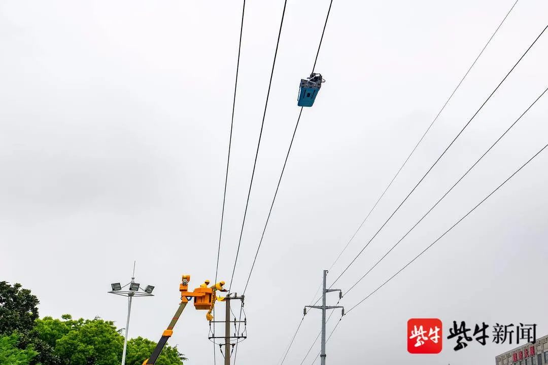 4月23日上午9点30分,在10千伏124方泾线作业现场,完成各项准备工作之后,带电作业人员搭乘绝缘斗臂车将带电绝缘涂覆机器人悬挂至待处理的17号和18号杆之间的导线上,地面人员熟练地通过远程遥控将机器人调整到指定位置,随即操作带电绝缘涂覆机器人开始自动涂覆绝缘涂料。