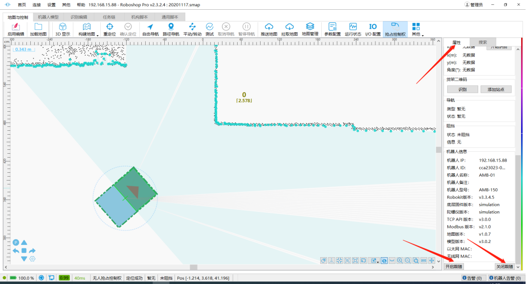 开启跟随模式只需在RoboshopPro 上面点击“开启跟随”按钮即可实现跟随模式,如下图: