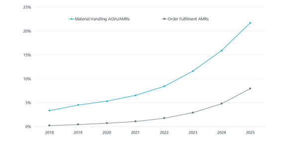 到 2020 年底,只有不到 1% 的仓库在支持履行操作中部署了 AMR(图 1)。物料搬运机器人是一种更为成熟的技术,在超过 5% 的仓库和制造设施中出现。展望未来,预计 AMR 将在 2025 年之前呈现强劲增长(图 2)。