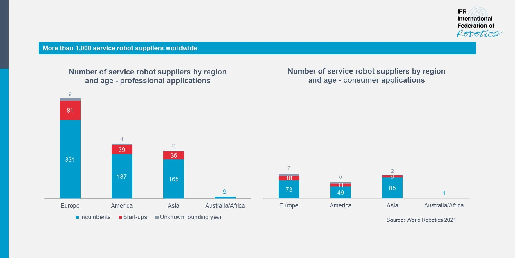在全球范围内,1.050 家服务机器人供应商中有 80% 被认为是在五年多前成立的老牌企业。47%的服务机器人供应商来自欧洲,27%来自北美,25%来自亚洲。
