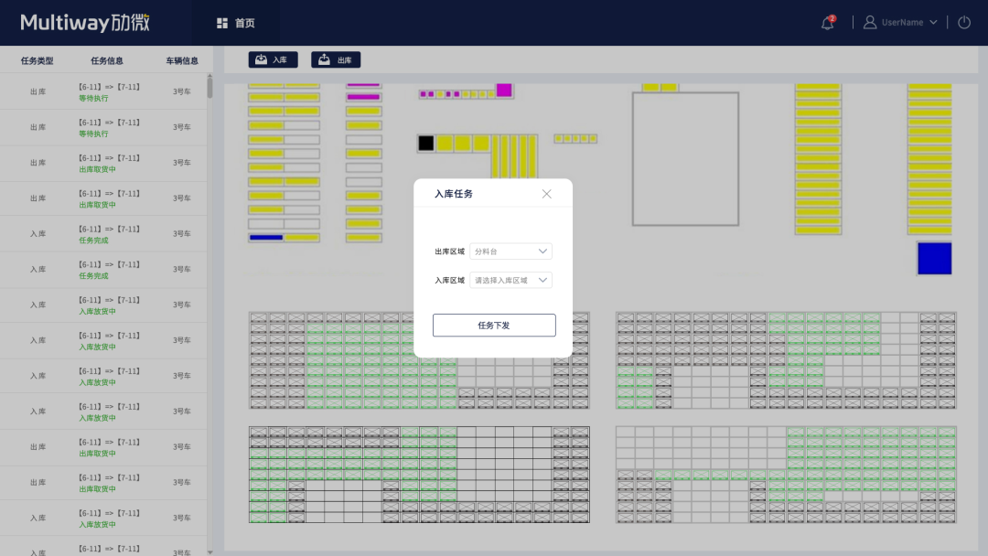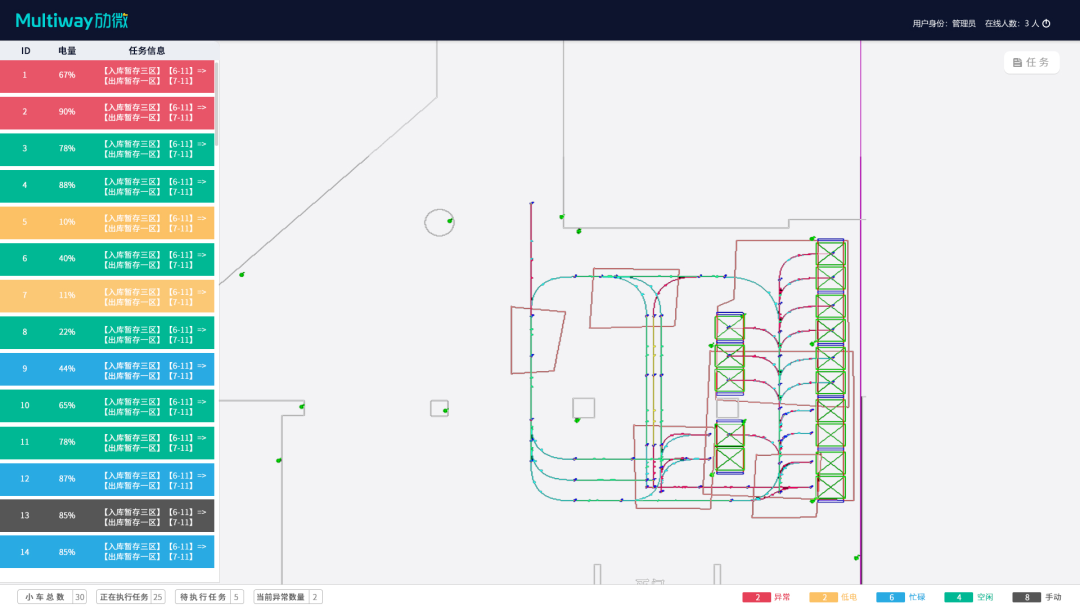MW RCS 劢微调度系统:调度系统能同时支持数百台不同车型车辆同一场地协同运行,并快速规划出最优路线,实现全局最优导航路线规划,在最短时间内完成任务,确保最高效率运行作业;