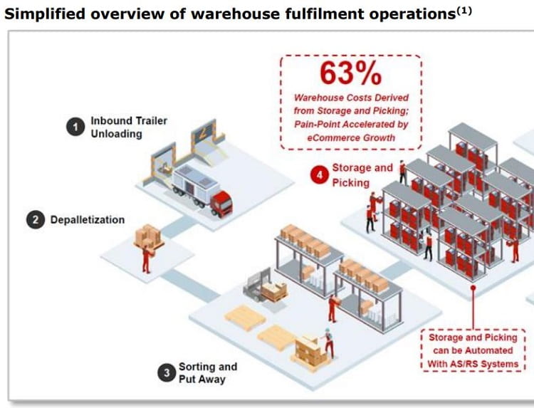 该公司的历史可以追溯到1996年,故事真正开始于2019年,当时私募股权公司Thomas H. Lee Partners(THL)收购了AutoStore,然后将该公司40%的股份出售给软银(THL仍然拥有AutoStore略高于50%的股份)。冗长的492页AutoStore IPO招股书提供了美元的财务信息,这是非常方便的,但由于正在合并的法律结构(Automate LuxCo和Terminator)相当混乱,所以阅读起来很困难。抛开这些杂乱无章的东西,我们看到的是一家专注于仓库主要痛点的公司--存储和分拣--占仓库运营成本的63%。
