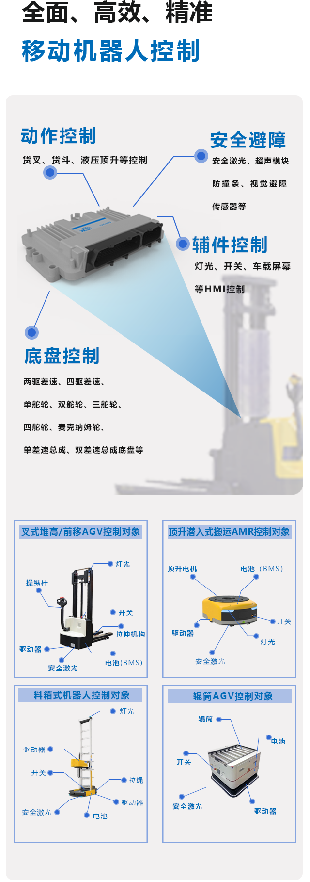 IVC300控制器是一款应用于各种车辆的专业车载控制器产品,具有高性能、高集成度、高可靠性等特点。产品配备完善的二次开发环境(符合IEC 61131-3标准,支持ST、FBD、LD),高度贴合车辆的应用场合。控制器具有三级安全运行控制管理、底盘运动控制分解算法、数据采集和通讯处理等功能。控制器支持标准CANopen、Modbus通讯协议以及自定义通讯协议。控制器支持数字信号输入、数字信号输出、模拟信号输入等功能。