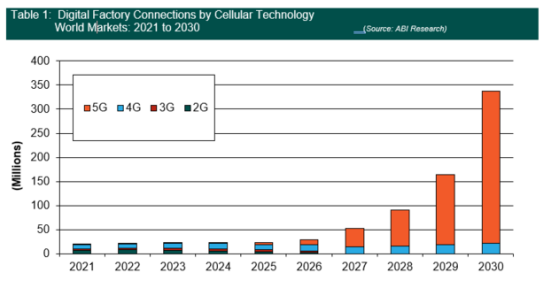 全球技术情报公司ABI Research预测,到2030年,5G将主导全球数字工厂连接,并拥有超过3.17亿的连接。这将使工厂车间的所有其他形式的蜂窝连接黯然失色;然而,5G的拐点预计只在2026年和2027年之间出现,因为第三代合作伙伴项目(3GPP)的工业用例标准已经成熟,设备生态系统也已成熟。