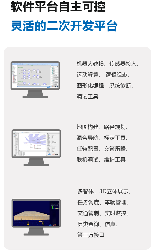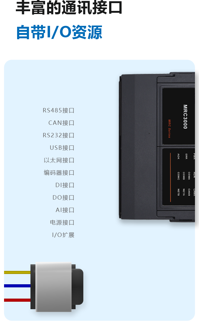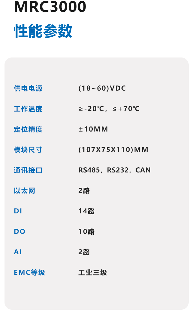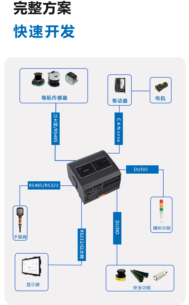 MRC3000是一款全自主知识产权的移动机器人领域专业控制器产品,特别适用于轻载搬运机器人。MRC3000具有高性能、高集成度、高可靠性等特点,内置自然导航、激光导航、二维码导航算法,支持多种国内外常用的型号导航传感器;内置两驱差速、四驱差速底盘运动功能块,自带丰富的I/O资源和各种通讯接口,不仅支持CANopen和Modbus等标准通讯协议,还支持采用非标的自定义串行和以太网通讯协议, 配备图形化二次开发平台(符合IEC 61131-3标准),快速实现各项功能逻辑。