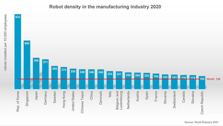 亚洲也是世界上机器人密度最高的国家的所在地。韩国自2010年以来一直保持这一地位,以932辆的数量超过全球平均水平的7倍。自2015年以来,机器人密度平均每年增加10%。凭借其在国际上成功的电子工业和强大的汽车工业,韩国经济有两个部门是工业机器人的最大客户之一。