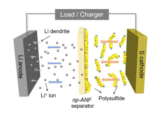 他们通过利用多硫化锂本身来做到这一点。它们粘在芳纶纳米纤维上,其负电荷排斥继续在硫磺电极上形成的多硫化锂离子。然而,带正电的锂离子则可以自由通过。