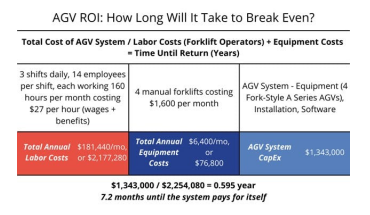 为了回答这些问题,大多数人想出了一个硬数字,将AGV系统的总成本与它能够取代的劳动力和人工设备进行权衡。这是一个很好的开始,但它并不能说明问题的全部。如果你仅仅根据这个数字来做决定,你可能低估了投资回报率。