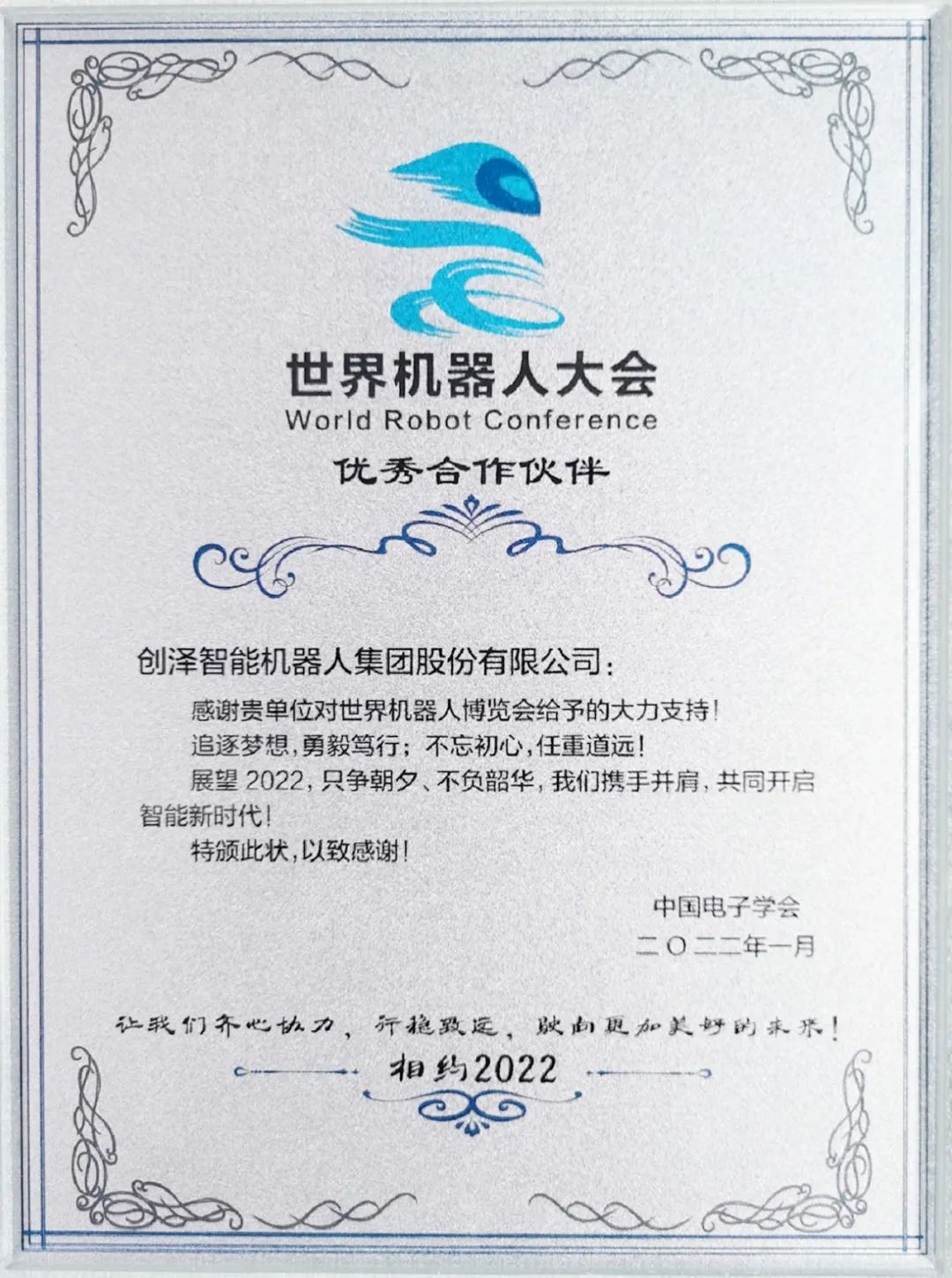 近日,创泽集团凭借多年的行业积累和持续的创新能力荣获2021世界机器人大会“优秀合作伙伴”称号。