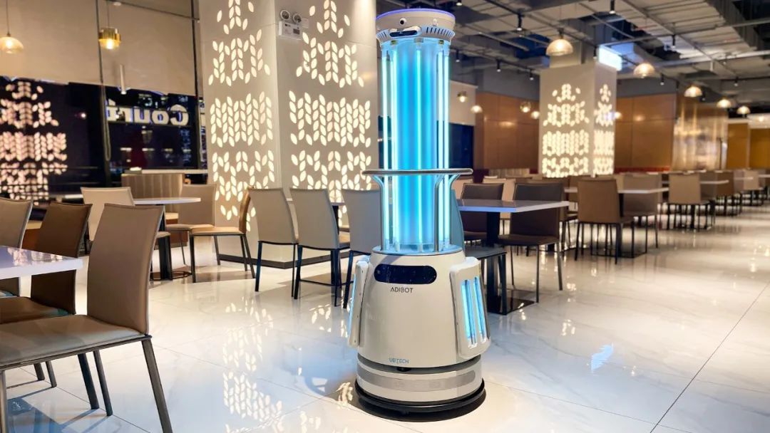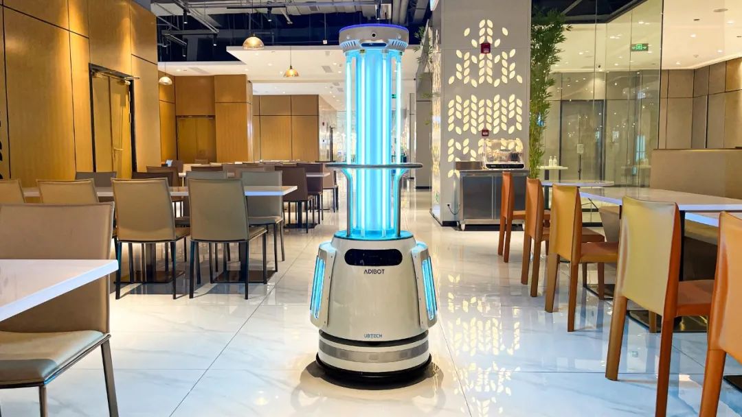 在深圳新一代产业园区的饭堂,ADIBOT净巡士用其独树一帜的“紫外线消杀技能”,消灭99.99%的有害病原体,包括新冠病毒、非典病毒、真菌以及细菌等,全力保障园区人员的用餐环境安全。