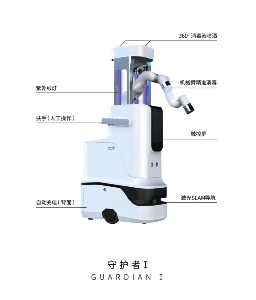 为了更好地解决以上这些问题,两方技术团队共同协作,耗时一年半,研发出了可在窄小过道通行的AGV与隐蔽、灵活的六轴消杀机械手臂完成协同工作的“守护者I”。