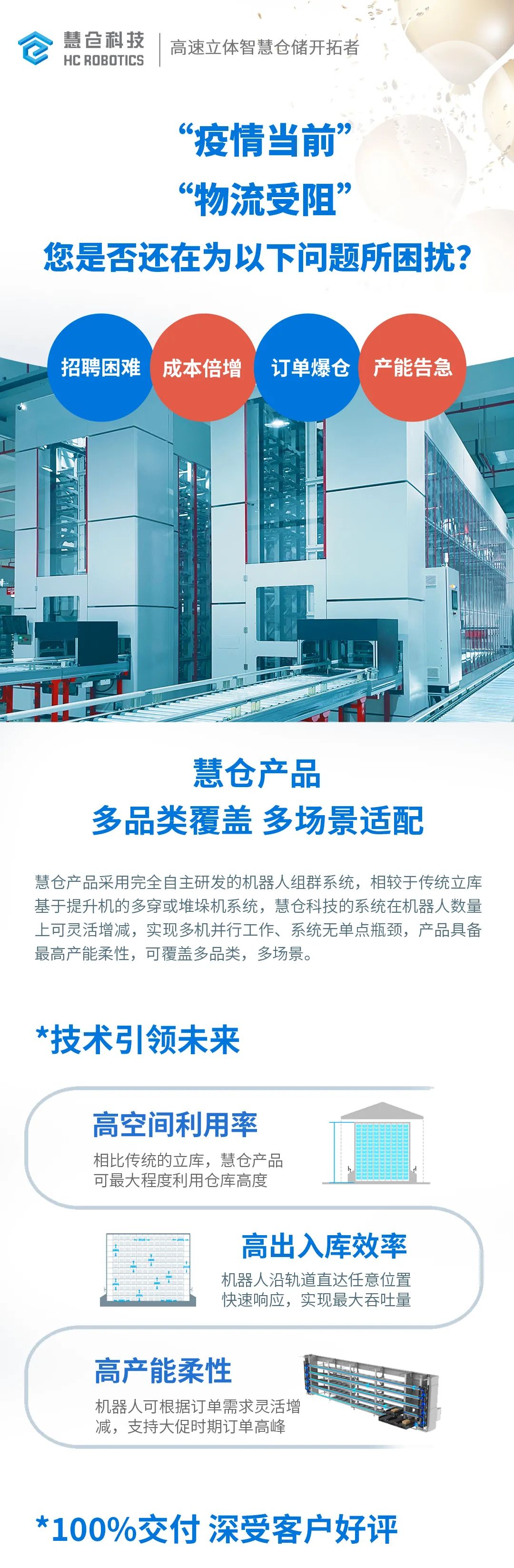 慧仓科技将不断提供高可靠性、高性价比的高速立体仓储产品,为您的仓储智能升级助力。