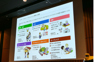作为结构改革特区的一部分,筑波市于 2011 年被认定为“移动机器人实验特区”。因此,Segway 将能够在公共道路上行驶,到目前为止,它已经行驶了 30,000 公里,没有发生任何事故。此外,电动轮椅的自动驾驶也在进行中。Doog的后续机器人“Souther”在与国家警察厅协商后也被视为行人,可以在公共道路上奔跑。我们正在努力推广“筑波超级科学城概念”。他说,他希望通过促进流动性、物流、政府、医疗保健、防灾基础设施、研发等的开放枢纽计划来提供跨领域服务。