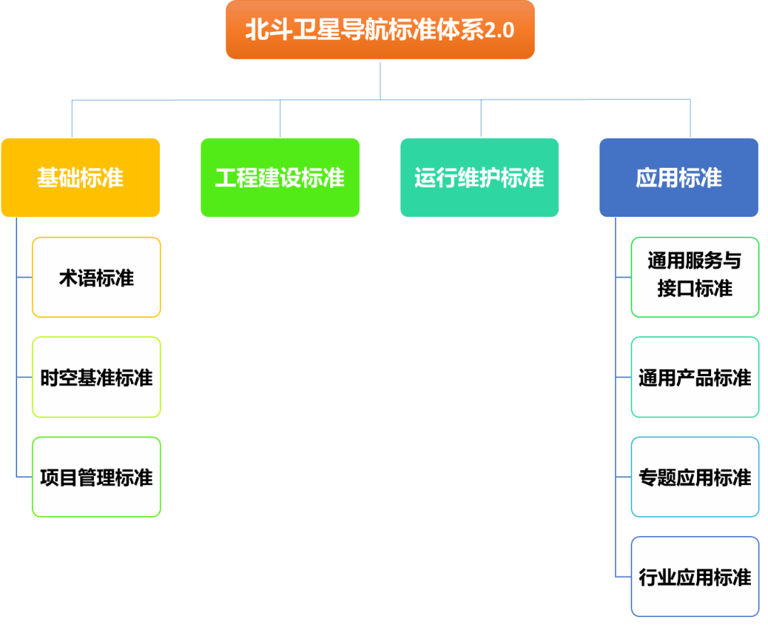 相较于《北斗卫星导航标准体系(1.0 版)》中仅仅分为基础标准和民用应用标准,《(2.0版)》保留了基础标准,新增了工程建设标准和运行维护标准,并修改民用应用标准为应用标准,进一步扩大了应用范围。其中基准标准包括术语标准、时空基准标准和项目管理标准3个二级分支,应用标准包括通用服务与接口标准、通用产品标准、专题应用标准和行业应用标准4个二级分支,相较于《(1.0版)》中5个二级分支进行了合并与精简。