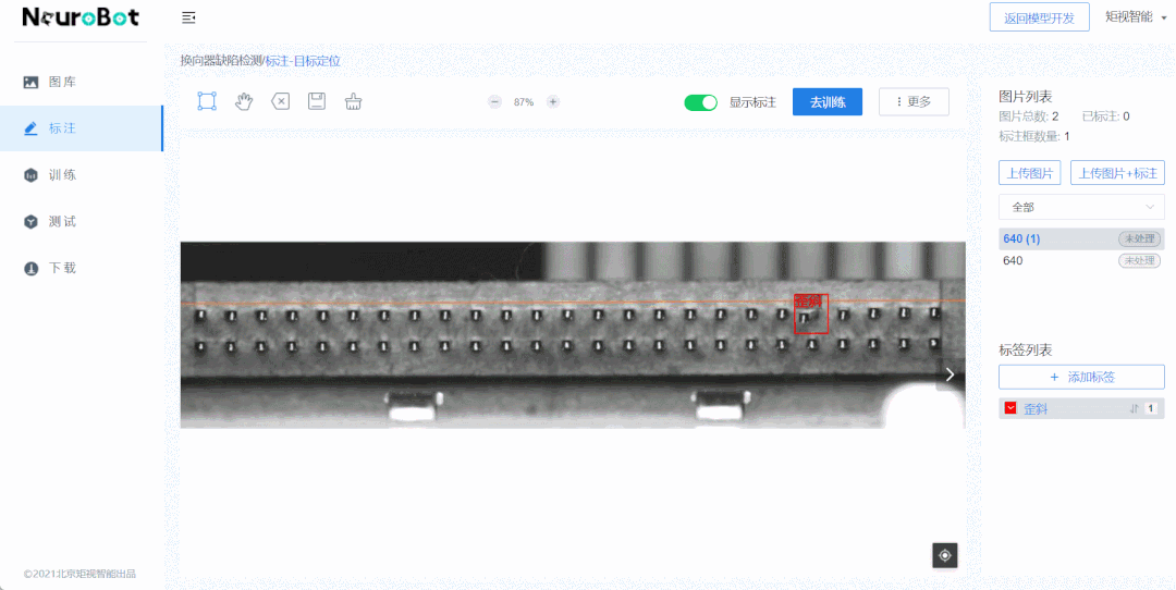 使用矩视智能低代码平台中【训练】和【测试】功能模块,进入深度学习阶段,实现检测需求。