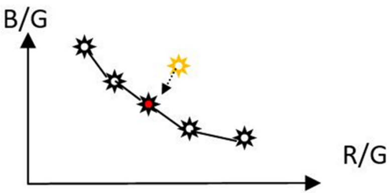折线上的点是在产线上针对不同光源(D65, A光,H光等)使用标准白/灰卡纸拍出照片算出来的B_gain和R_gain坐标,黄色点是使用白点法实时计算出的坐标,那就找到一个靠近的先验值(红色点),取该点的gain值。