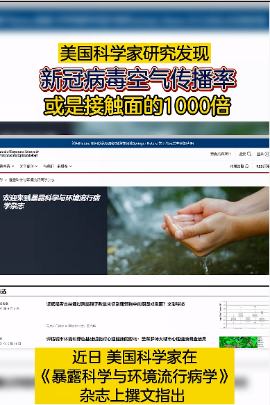 近日,美国科学家在《暴露科学与环境流行病学杂志》上撰文指出,新冠病毒空气传播率是接触面传播率感染的1000倍,人们从空气中吸入病毒的几率要高得多。该研究预测,通过吸入有新冠病毒的气溶胶颗粒感染的概率可高达百分之一,而接触受污染物品表面之后感染的概率为十万分之一。