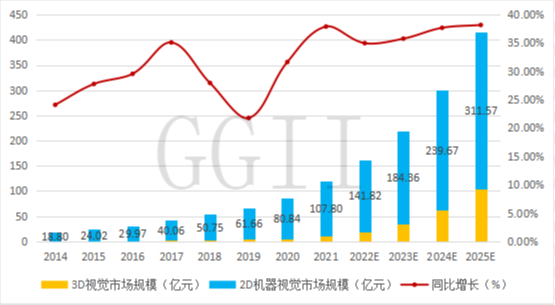 受新冠疫情影响低迷的新能源物流车市场在进入2021年后强势回暖,市场销量瞩目。据统计,2021年前10月新能源物流车销量为93754辆,同比去年前10月新能源物流车暴增141%。随之而来的物流行业的爆发拉动了相关企业的扩产需求,视觉检测与视觉定位产品需求增长明显,2D视觉市场规模约为104.84亿元,3D视觉市场约为11.51亿元。此外,传统工业产品的回暖也为机器视觉带来生机,加之企业招工难倒逼企业生产线自动化,加速机器视觉行业需求增量上涨。根据GGII预测,至2025年我国机器视觉市场规模将达到415.92亿元,其中,3D视觉市场规模将达到104.35亿元。