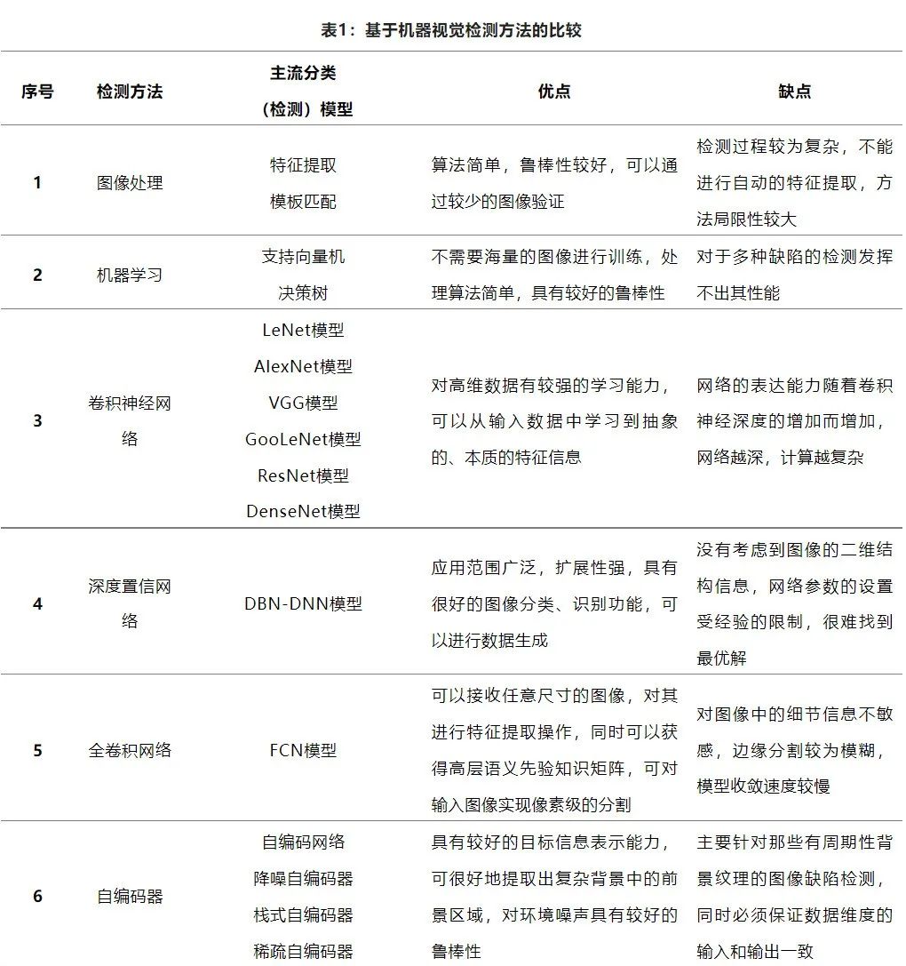 基于机器视觉的缺陷检测方法的比较如表1所示,包括各种方法的主流分类(检测)模型、优缺点对比。
