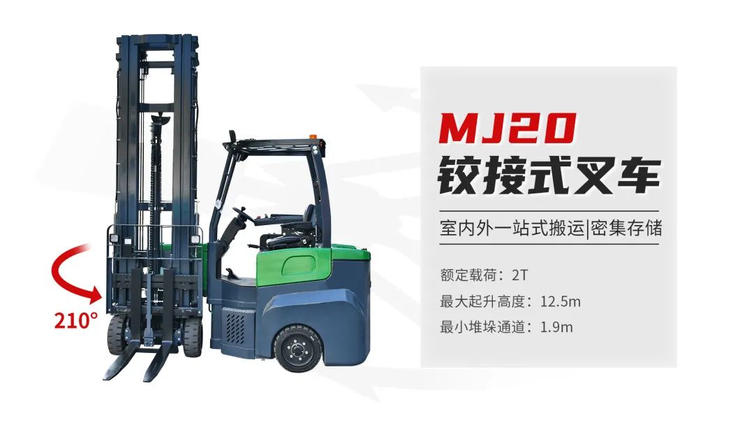 MiMA携带的MJ20是LogiMAT物流展现场唯一的铰接式叉车展品。该叉车载重2吨,最大起升12.5米,门架摆角可达210°,适用于窄巷道密集性存储。采用橡胶胎,集室外搬运与室内装卸于一体,一车两用,极大满足了中重型工况的需求。