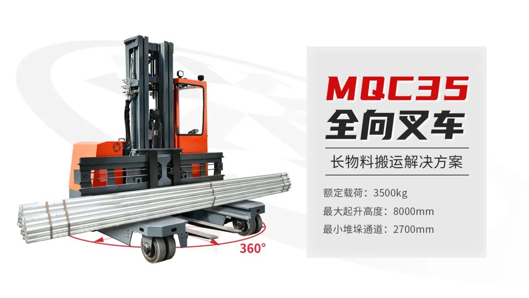 MQC双驱全向叉车是一款适用于长物料搬运的车型,额定载重3.5吨,起升可达8米。具备多向行驶和原地回转的功能,满足需要高周转率的工况。全部采用橡胶轮胎,对地面适应性更高。