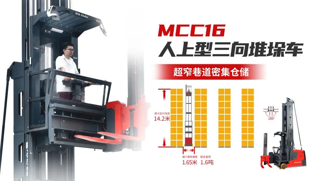 现场展示的MCC16人上型三向堆垛车是一款适用于中高位窄巷道堆垛的叉车。额定载重1.6吨,起升高度可达14.2米,通道宽度仅需1.65米。驾驶室可起升进行高位拣选作业,拥有良好的作业视野和功能扩展性。