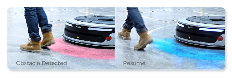 除硬件方案外,MP1000R还装载安全避障算法,根据障碍物的远近,调整平滑减速策略。通过激光识别货架,匹配系统中存档的货架模型,根据负载尺寸动态调整避障区域。此外,针对侧向靠近机器人运行区域的人员和障碍物,MP1000R也能提前预判,及时做出停障、避障策略,全方位保障安全。