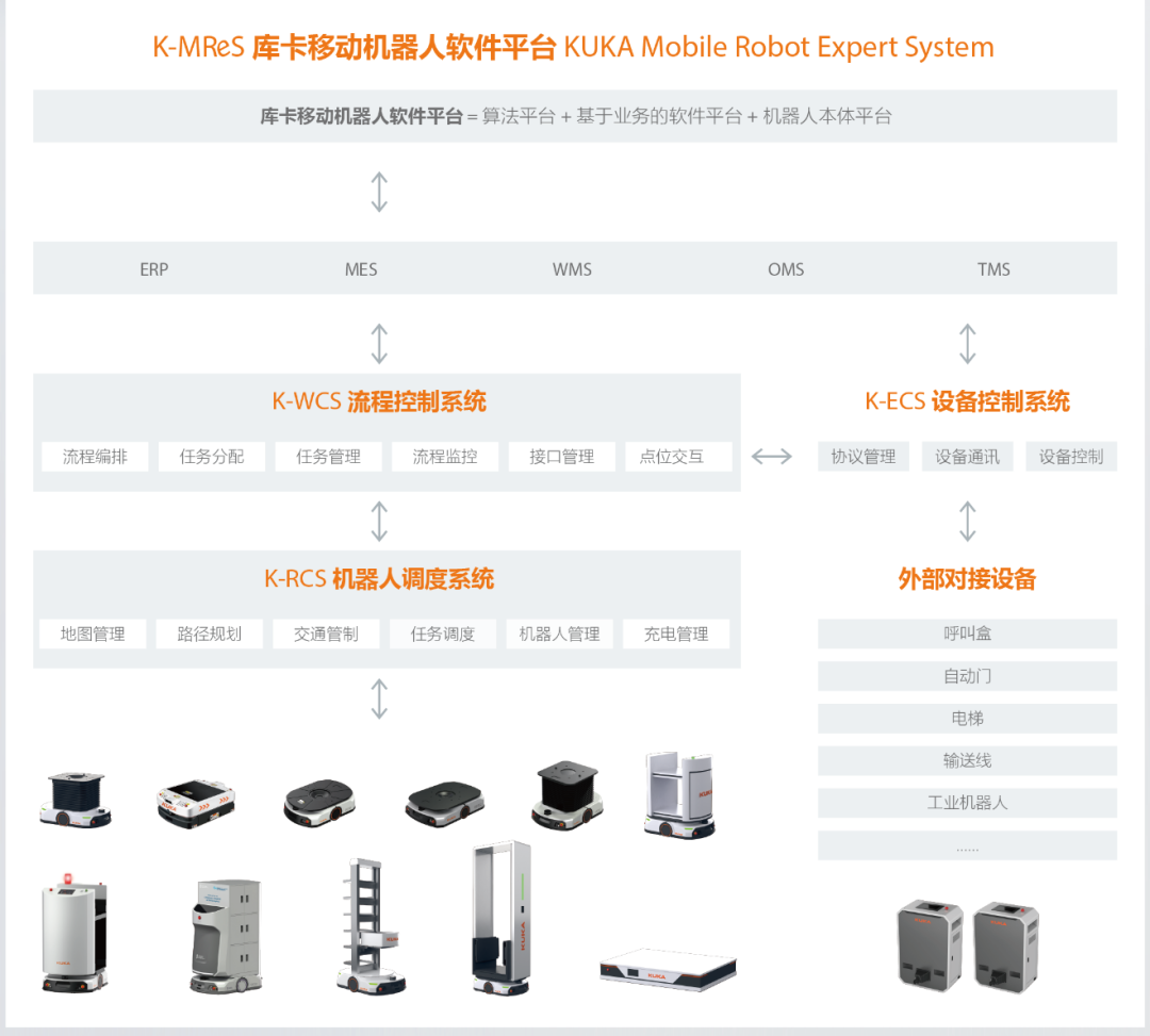 K-MRS软件平台包含K-WCS(流程控制系统)、K-RCS(机器人调度系统)和K-ECS(设备控制系统)三大模块,可无缝对接上层系统,数据信息获取,任务流程编排、多机器人调度协同、外部设备对接调度等功能,实现工厂制造的自动化、智能化和数字化。