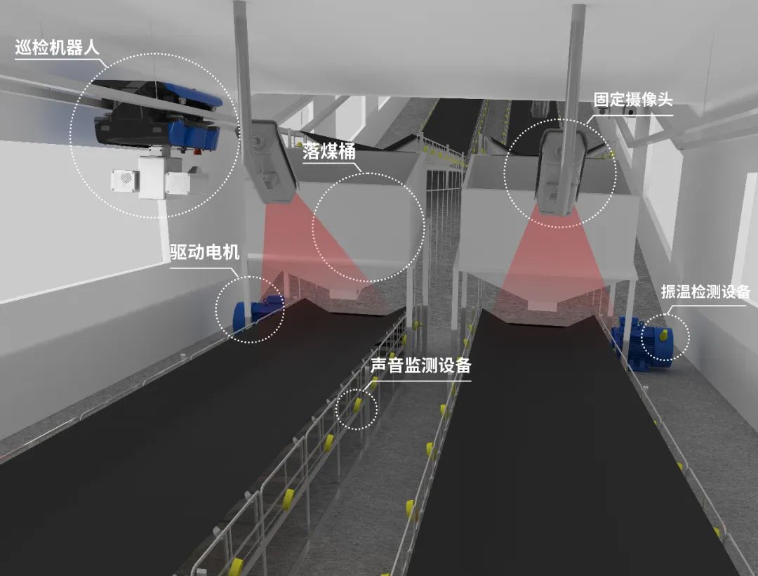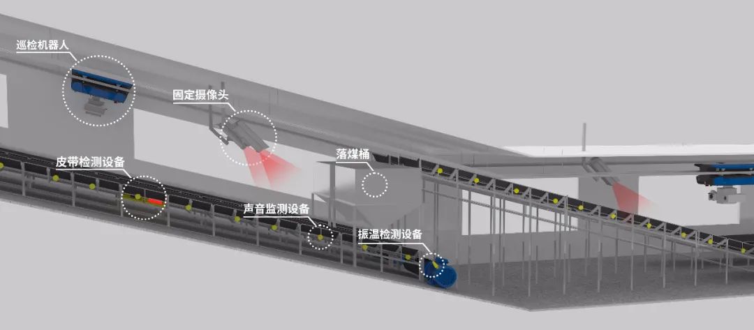 利用巡检机器人+固定传感+固定监测等边缘采集设备,辅以智能识别算法技术,实现输煤栈桥场景指示灯仪表、托辊、皮带、煤料、电机、落煤桶、箱体等设备的自动巡检、识别、分析,实现输煤栈桥场景全覆盖巡检。