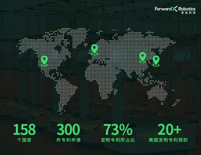 一系列亮眼数据的背后,有灵动科技在海外成果的体现。不仅在国内,灵动科技 “订单到人”在海外项目展示上也表现抢眼,其工作效率和交付能力令很多美国业内人士为之瞠目,以寻求更广泛和更深度的国际合作。因此,越来越多的国际知名企业都在关注并积极引入灵动科技的技术方案。例如,2021 年 10 月灵动科技曾为日本一家工厂部署移动机器人,从 10 月 7 日快递将数十台 AMR 送达,到 10 月 15 日工厂完成验收,仅仅用了 8 天时间,其高效部署与执行力赢得用户赞叹。灵动科技在日本市场的出色表现,也吸引到更多企业的目光。据透露,日本某家拥有百年历史、业务遍及世界各地的制药企业集团(旗下拥有某著名运动饮料品牌),现已与灵动科技达成合作意向,并将在近日正式对外宣布,灵动科技 AMR 的身影即将出现在其物流仓库中,助力其全球业务拓展。极速的商业落地得益于专利的保驾护航。目前,灵动科技专利布局高度聚焦于自动驾驶、机器人、自动运输车等相关技术领域,已在全球 158 个国家/地区中累计申请了超过 300 件专利,发明专利所占比例超过 73%,并已经取得 20+项美国发明专利授权,展现出较高的技术创新水平。