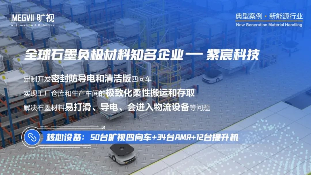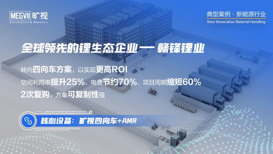 在仓储物流方面,主要通过自动存取系统(AS/RS)实现高密度存储和自动化作业,方案以四向车系统或堆垛机系统为主,并涉及与AMR、机械臂、叉车、环形穿梭车、风淋设备、叠托打带等不同类型物流设备的协同作业。例如,旷视已赢得赣锋锂业的2次复购,并助力客户从堆垛机系统转向ROI更优的四向车系统;紫宸科技基于旷视“四向车+AMR+河图”的解决方案对其溧阳工厂仓库进行自动化升级。