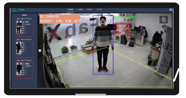 实时检测识别区域内人员的身份信息,对身份不正确的员工进行语音告警。实时检测识别区域内人员的服装穿戴,对服装穿戴不规范的员工进行告警。