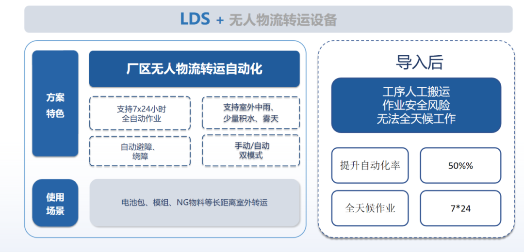 传统厂区物流人工成本高、运输效率低、生产安全风险不可控,磅旗推出LDS+无人驾驶物流转运车一体化整体解决方案,以无人驾驶物流车实现厂区生产资料、适应多重复杂环境与恶劣天气,满足在不同工况下的全天候多种场景长距离物流作业。全程自主规划行驶路径并在行驶中实现自主避障、自主泊车等功能。车辆“去安全员”设计,无需人工操作,即可安全、高效地完成货物7X24小时运送。